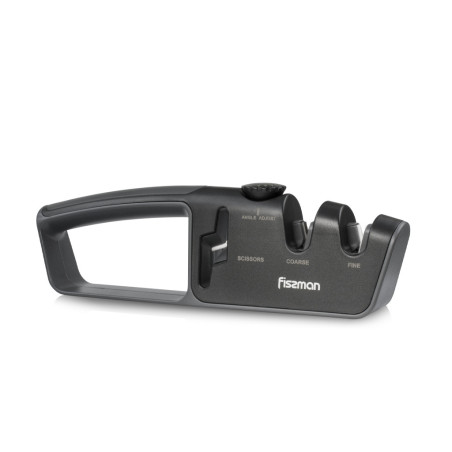 The knife sharpener with carbide and ceramic stones offers two stages of sharpening (COARSE and FINE) for all types of straight edge knives. The ergonomic handle provides a comfortable and secure grip.The angle of the abrasive components can be simply adjusted to match the angle of the original factory grind. A special slot for sharpening scissors.Not suitable for dishwasher, cannot be soaked in water.
