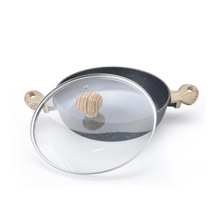 The BLACK COSMIC series from FISSMAN is innovative cookware made from natural eco-friendly materials. Aluminium heats up quickly and distributes heat evenly. Safety is achieved with the extra-strong multi-layer coating Platinum. FISSMAN was the first brand that began to use the Platinum coating for the production of its cookware, focusing on natural safe raw materials. • Platinum - professional coating recognised by professional leading chefs. • The frying pans have a noble black colour with golden speckles and look luxurious and aesthetically pleasing. • The coating is corrosion and abrasion resistant. The different colour speckles are responsible for the resistance to different types of impact, and the manufacturer uses layers that protect against different types of damage. • BLACK COSMIC products are manufactured using natural materials, therefore are safe health and do not harm the environment. • The rough surface is ideal for cooking to a delicious crispy crust. • The bakelite soft-touch handles are pleasant to the touch, non-slip and heat resistant with a wooden effect. • The deep shape allows you to cook for the whole family, saving time, effort and energy. The high sides are great, not only for frying but also for stewing dishes. • Transparent lid, which allows you to monitor food preparation whilst being protected from any splashes on skin or clothing. • Suitable for all hob types including induction. The BLACK COSMIC series is one of the best from the FISSMAN cookware collection. The quality of the products has been tested over the years. A FISSMAN Platinum coating frying pan will be a reliable assistant in the daily preparation of tasty and healthy food. Choose the best for your family: trust the FISSMAN experience.