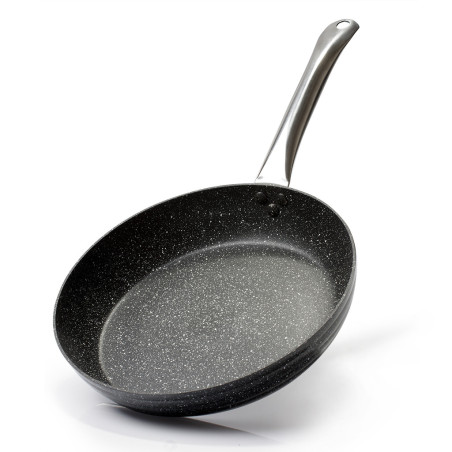 The frying pan ELBRUS STONE with a steel handle is made of aluminium with a non-stick coating Platinum. One of its main advantages is the multilayer ultra-strong non-stick coating Platinum which consists of a few layers of natural fine-grained stone chippings based on mineral components. Features of the coating: 4 layers, thickness: 25-35 µm, hardness: HB, wear resistance: 4000 cycles, healthy and environmentally friendly. Dishwasher safe but please use a mild liquid gel detergent.