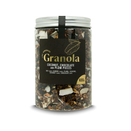 Sudedamosios dalys: be gliukozės, MANDELAS, 13% džiovintų plunksnų, INDIJOS RIKSTAS, 10% šokoladinių grūdų (sūkeris, kakavos milteliai, kakavos sviestas, emulgatorius: SOJAS lecitinas), kokosų grūdų 10%, rafinuotas kokosų aliejus, vaisių sirupas, cukrinis cukrus Demerara, kakavos milteliai, malto cinelis, jūros druska.