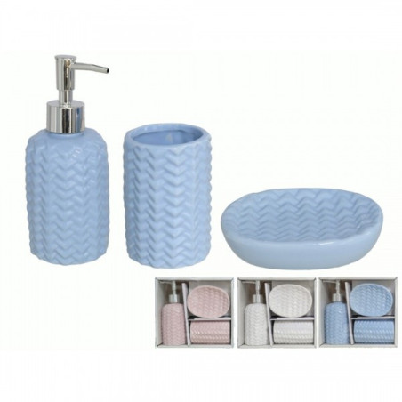 <p>Rinkinį sudaro: muilo dozatorius, stiklinė, muilinė;</p> <p>Medžiaga: keramika;</p> <p>Galimos spalvos: pilka, balta, juoda, melsva, rožinė.</p>