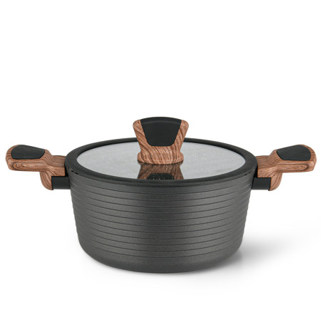 Katls ar stikla vāku DIAMOND 20x10 cm/2600 ml izgatavots no augstas kvalitātes izturīga alumīnija ar pretpiedeguma parklājumu Greblon. Alumīnijs ātri uzkarst un ilgi uztur siltumu. Daudzslāņu pārklājums Greblon izgatavots no ekoloģiski tīra materiāla un sastāv no vairākām akmens daļiņām un keramikas plankumiem. Pārklājums ir antibakteriāls un izturīgs pret koroziju un tam ir visaugstākā izturība pret bojājumiem un nodilumu. Vāks ar silikona malu un tvaika izlaišanas caurumu izgatavots no caurspīdīga triecienizturīga stikla. Divkrāsu bakelīta rokturi neuzkarst. Katls piemērots visu veidu plīts virsmām, drošs videi un cilvēka veselībai. Atļauts mazgāt trauku mazgājamajā mašīnā.