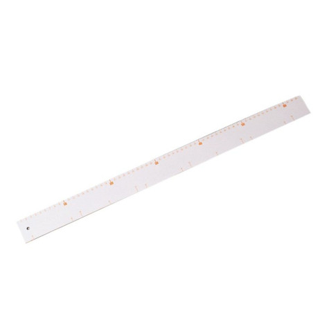 Balts lineāls ar melnu/sarkanu skalu. Jūsu ērtībai lineālam ir 3 atzīmes: 7 atzīmes ik pa 8 cm; 5 atzīmes ik pa 12 cm un metriskā skala. Materiāls: plastmasa, biezums: 0.2 cm.