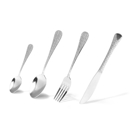 Набор столовых приборов 24пр. изготовлен из нержавеющей стали. Столовые приборы являются важным элементом сервировки и придают столу законченный органичный вид. Комплект столовых приборов станет украшением не только стола, но и прекрасно подойдет для повседневного использования. Набор выполнен в едином художественно-конструкторском решении и является результатом совместной работы дизайнеров и технологов нашей компании. Полное соответствие мировым стандартам производства и передовые технологии гарантируют безопасность и непревзойденное качество продукции. Глянцевая полировка рабочих поверхностей и оригинальная отделка ручек создадут праздничную атмосферу и украсят стол. Безупречное качество, изысканный дизайн и удовольствие от каждой трапезы. Не рекомендуется мыть в посудомоечной машине.